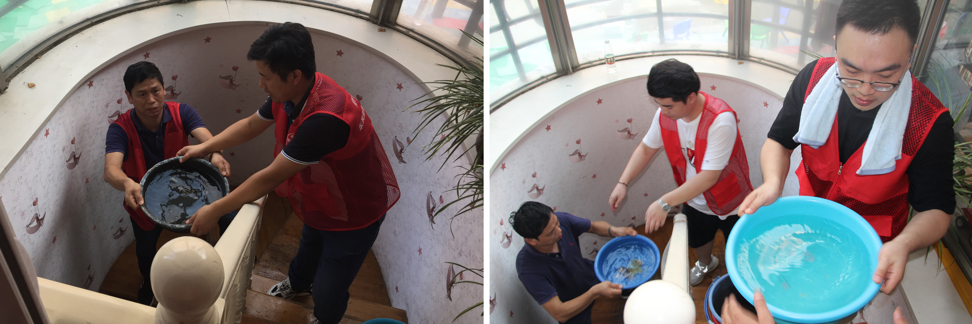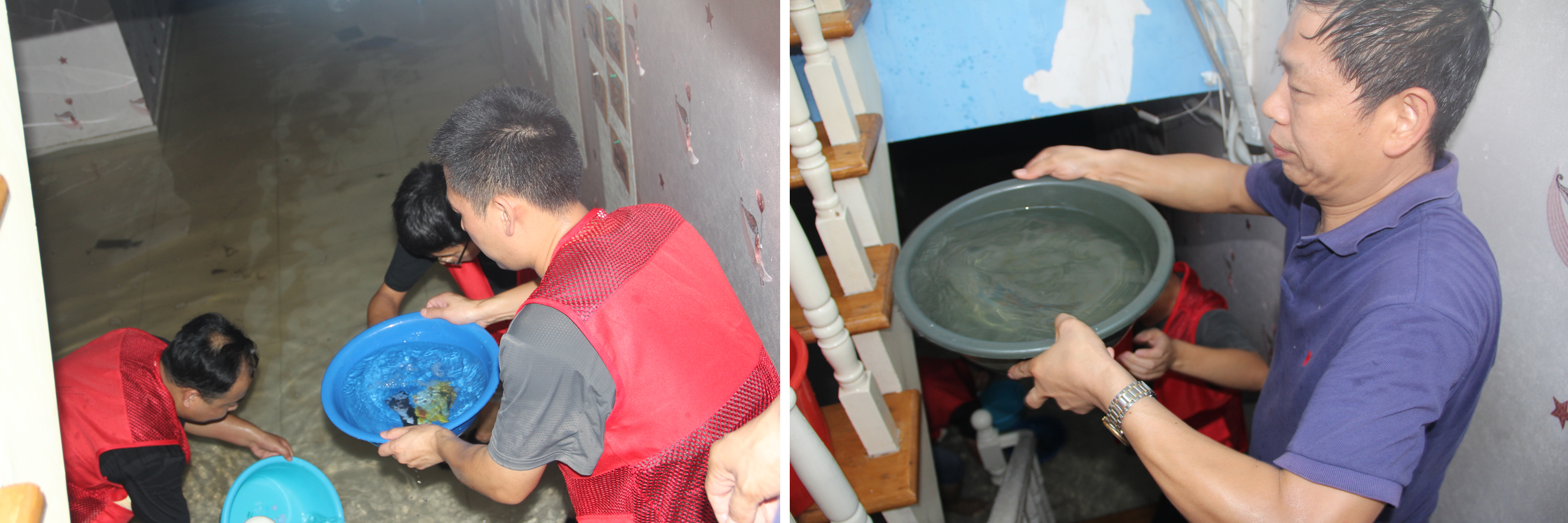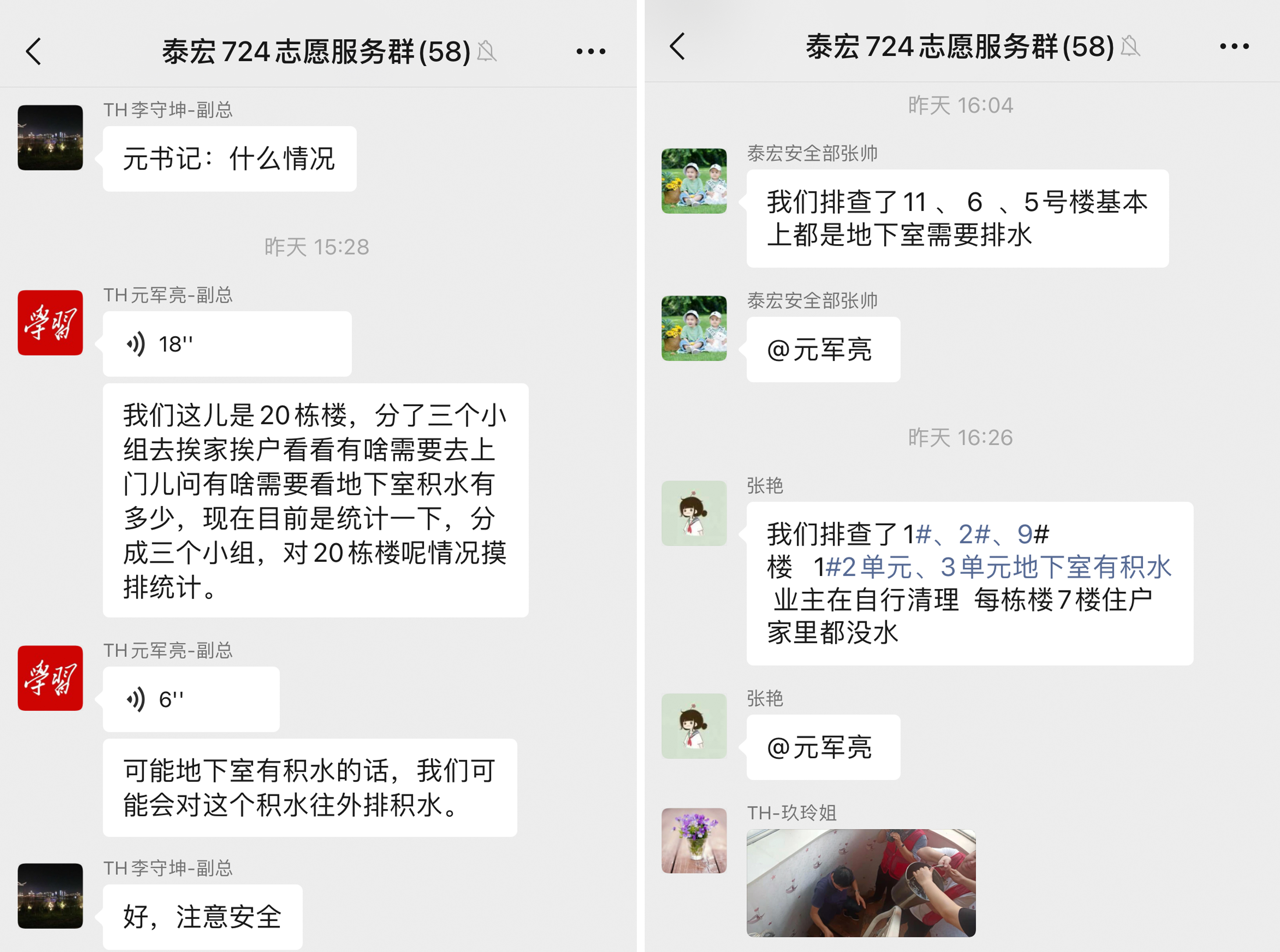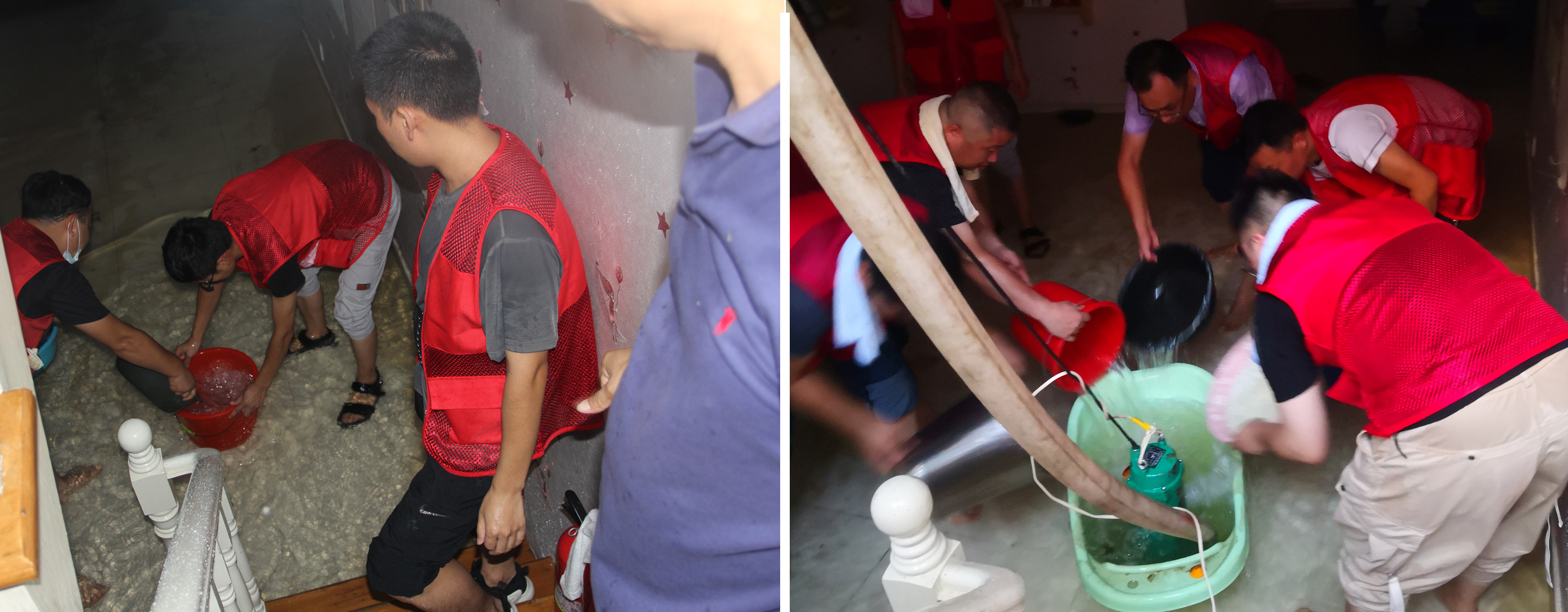 任务收到!!!在社区党委书记张振刚同志、社区主任李保奇同志的统一安排下,大家对社区20栋楼,800多户居民进行了询问排查,发现地下室积水比较严重,在公司党支部书记元军亮同志的带领下,大家用发电机、水泵、水盆、水桶等各类工具进行排水,光着脚战斗6个多小时,终于把积水排完。