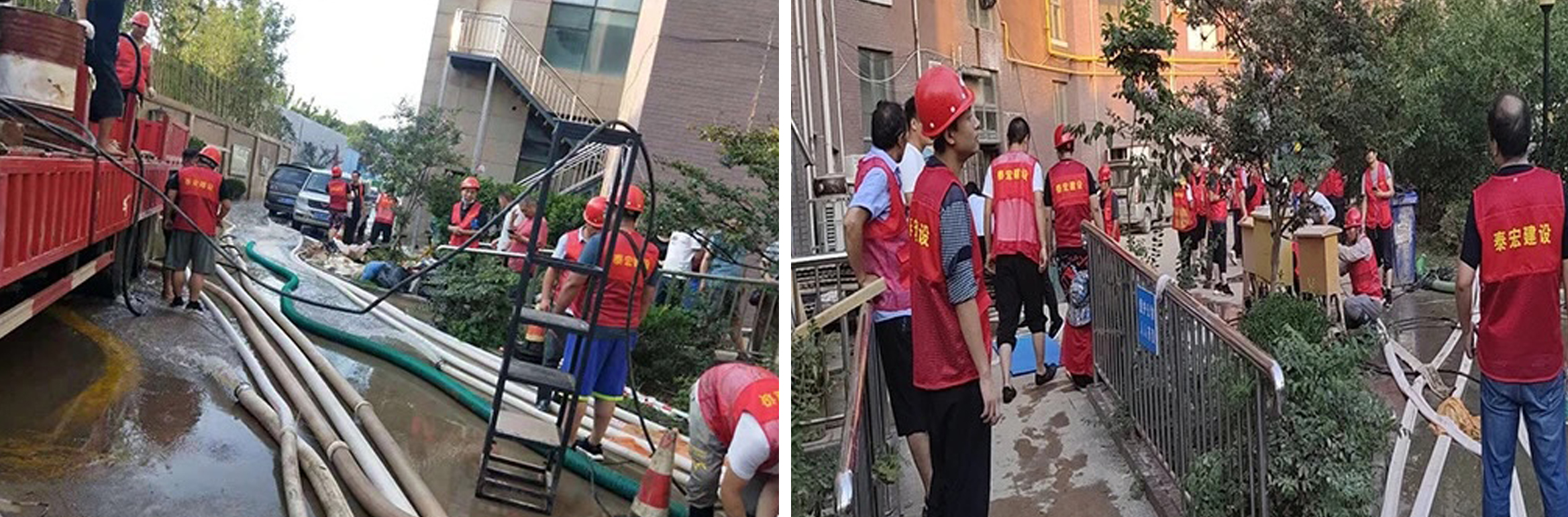 按照市住建局部署,公司统一安排,泰宏建设第一公司各项目立即奔赴金水区丰产路办事处东峰听橹小区,天裕小区,郑州商务宾馆,红旗路80号院、94号院,尚城宾馆,爱泊酒店等地方参与灾后救援排水工作。公司总经理宋广明亲自上阵安排、指挥,常务副总赵建国,第一公司王道军,王刚,秦朝,董政,杨强、倪铁虎等领导按照分工,立即组织现场排水。各项目携带发电机组,抽水泵等设备积极投身一线,在最快的时间完成现场调配调试,开展排水工作。